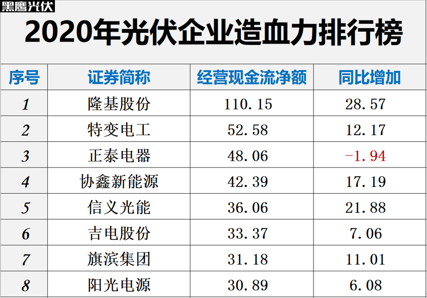 据黑鹰光伏统计,2020年106家光伏上市公司合计造血(经营现金流净额)908.76亿元,同比增长了5.02%,增速明显下降,2019年经营现金流净额增幅为58.39%。