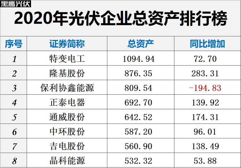 另据统计,2020年有87家光伏企业总资产实在正增长,48家企业总资产增长在10亿元以上,6家企业增长在100亿元以上,前三名为隆基股份、增长283.31亿元,通威股份、增长174.31亿元,正泰电器、增长139.92亿元。