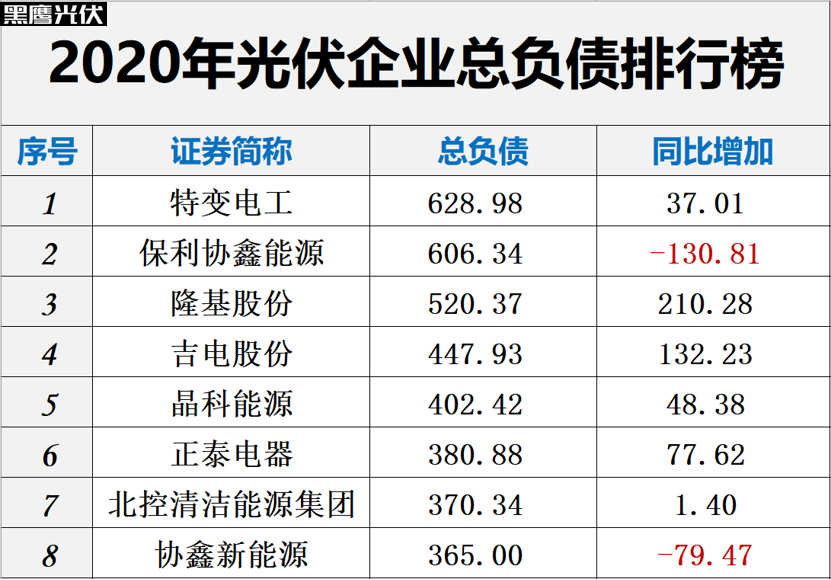 其中,多达24家光伏企业总负债规模在100亿元以上,前三名为特变电工、总负债628.98亿元,保利协鑫能源、总负债606.34亿元,隆基股份、总负债520.37亿元。