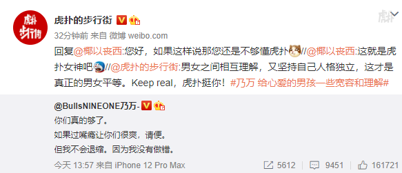 这场“网络狂欢”背后,也引发了被网友称为“微博女拳”和“虎扑直男”这两个社区文化拥戴者的激烈碰撞。作为直男聚集地的虎扑,显然“站”到了乃万这边,有支持乃万价值观的,有欣赏乃万面对“网络暴力”却坚持维护自主话语权态度的。