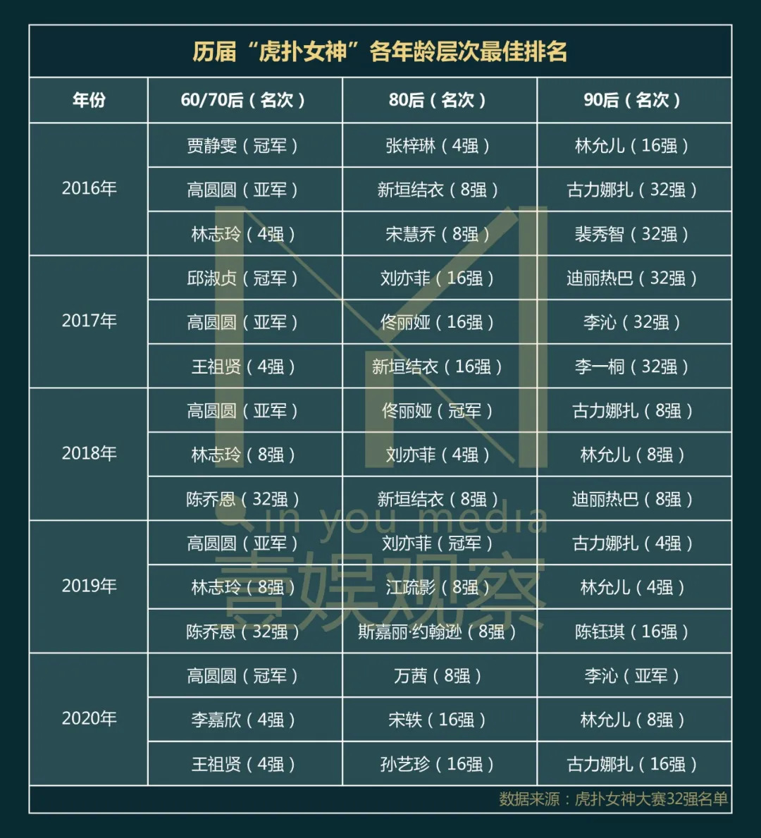 通过历届32强年龄层分布显示,主要活跃用户年龄为 24 ~35 岁的虎扑社区,JRs选择的女神大多是和他们同龄的80后女星,甚至比他们年纪更大的 60 后 70 后女星,以上这些年龄段占比78.21%,而目前娱乐市场上流量更高、热度更强的90后群体仅有21%。96年出生的乃万概率相对减少。