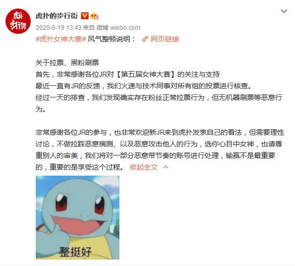 最后在这次的女神大赛刷票和控评行为出现后,虎扑社区慢悠悠地发布了一条风气整顿声明,并表示会对“恶意带节奏的账号进行处理”。