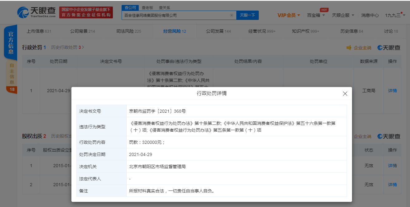 据天眼查APP显示,近日,百合佳缘网络集团股份有限公司新增一条行政处罚,决定文书号京朝市监罚字〔2021〕368号,处罚事由为侵害消费者权益,处罚结果为罚款320000元,处罚单位为北京市朝阳区市场监督管理局。