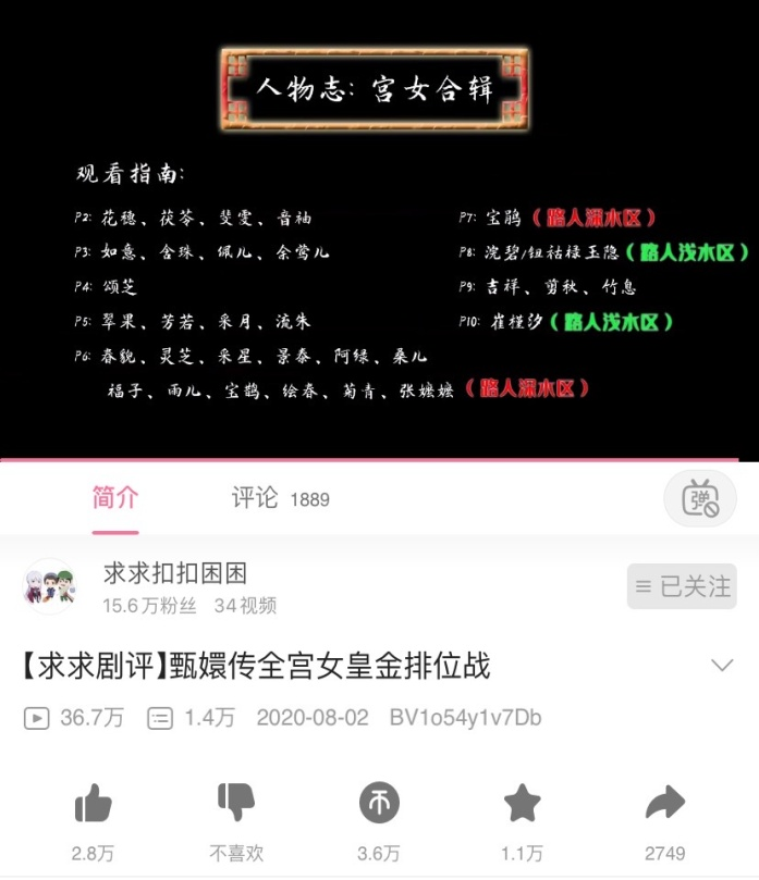 二是对人物以及人物关系的分析,其中人物的分析不仅涉及华妃年世兰、皇后宜修这样的核心人物,甚至B站UP主@求求扣扣困困对每一个宫女都有独立的人物研究。
