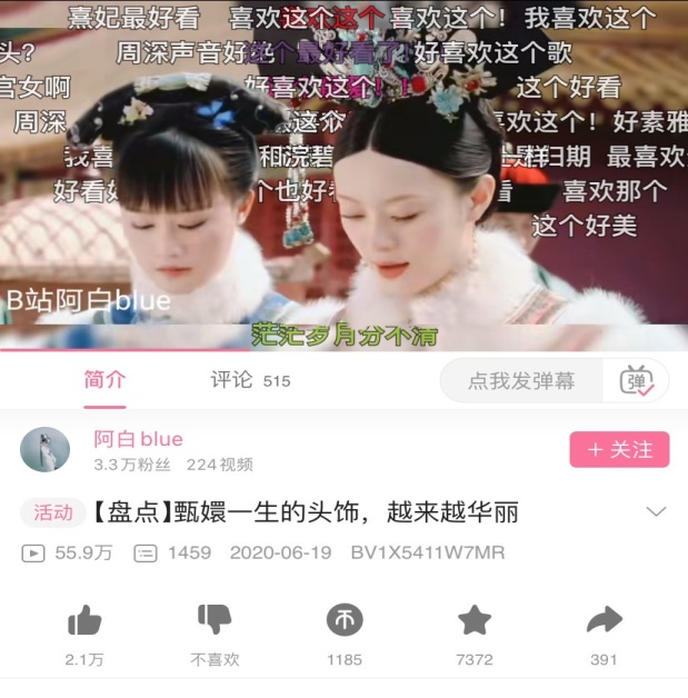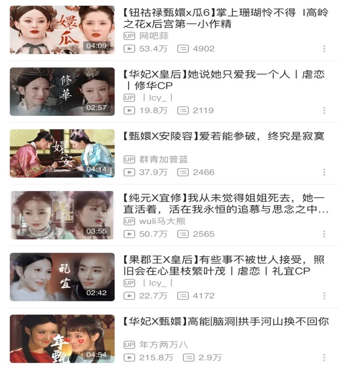 四是对剧情的剪辑再创作,依靠剧中的画面塑造新的故事和新的CP。UP主@年方二万八剪辑的年世兰和甄嬛CP故事虽然以悲剧收尾,但仍有不少人在弹幕直呼“太甜了,磕到了”,播放量超过200万。