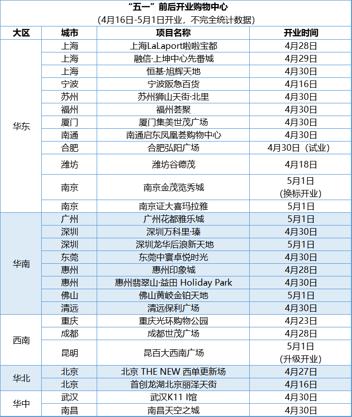 据不完全统计,为了迎接今年的“五一”黄金假期,全国各有近30个开业项目,仅仅在4月30日就有10余项目齐齐亮相,阵仗强大。