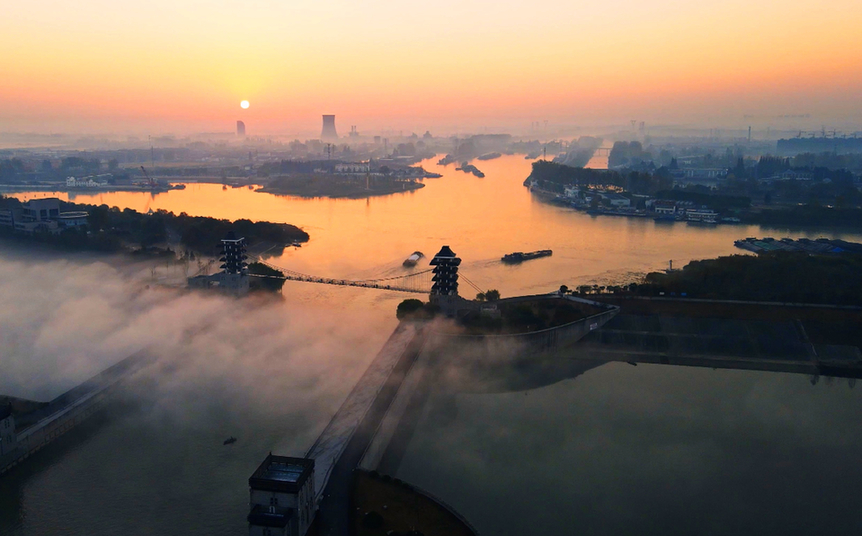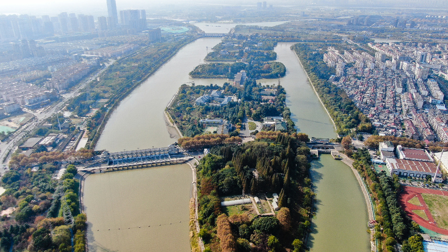 ↑位于江苏扬州的江都水利枢纽(2020年11月14日摄,无人机照片)。江都水利枢纽位于京杭大运河、新通扬运河和淮河入江水道交汇处,南濒长江、北连淮河,是南水北调东线工程的源头。