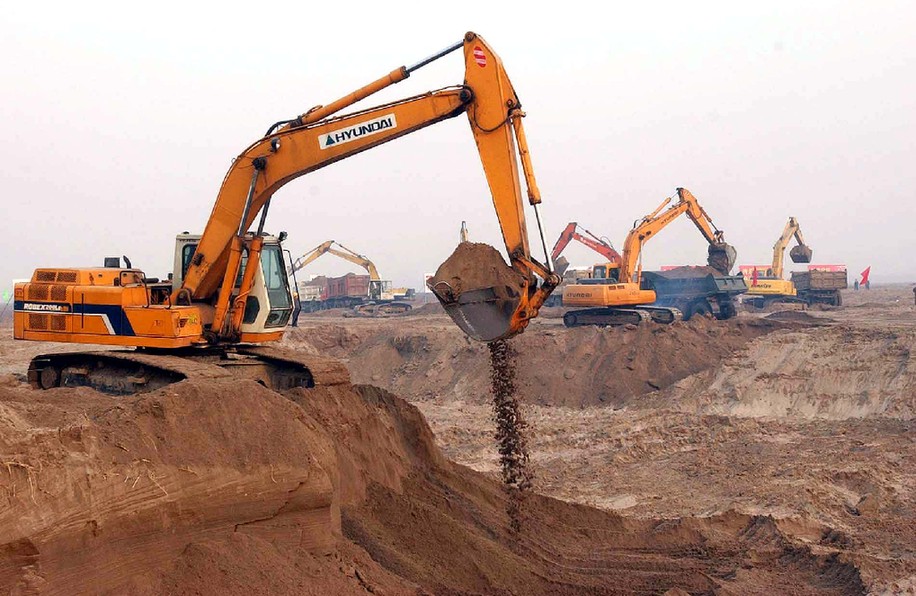 ↑2002年12月27日,南水北调东线工程正式开工,工程机械在位于江苏扬州宝应县的潼河工地上投入施工。