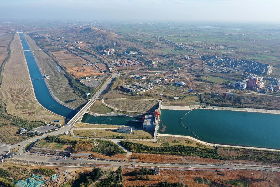 ↑位于河南南阳淅川县的南水北调中线工程渠首(2019年12月9日摄,无人机照片)。