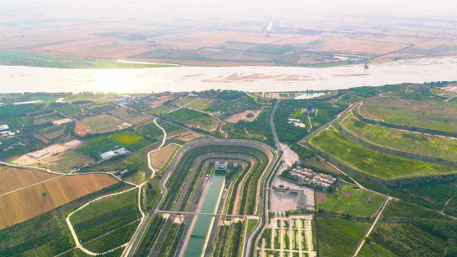 ↑这是跨越黄河的南水北调中线穿黄工程(2020年5月26日摄,无人机照片)。工程位于黄河南岸(画面下方)的河南郑州荥阳市和北岸(画面上方)的焦作温县境内,主要任务是安全有效地将中线调水从黄河南岸输送到黄河北岸。