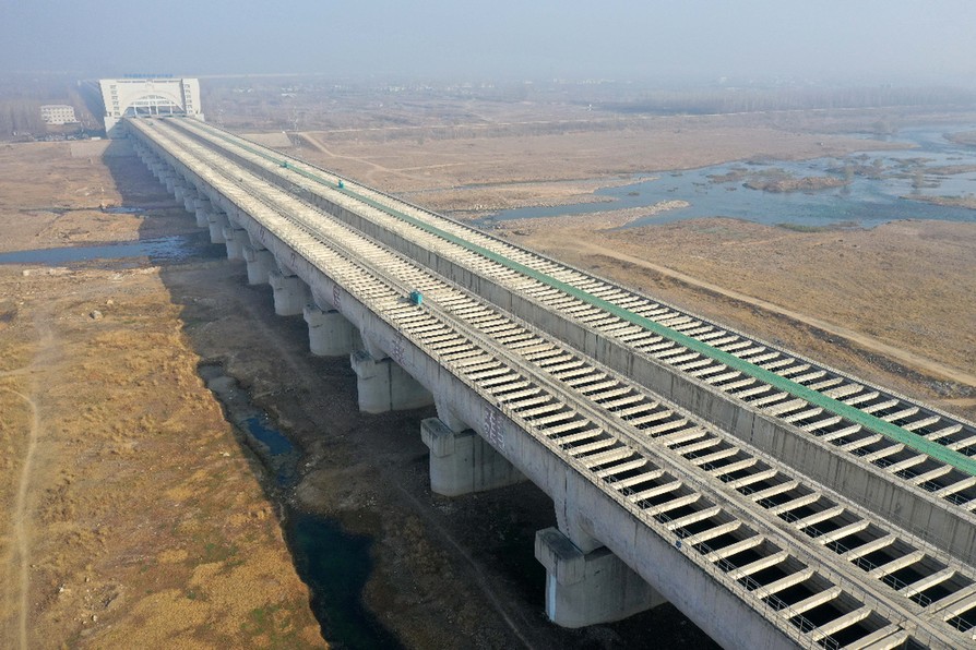 ↑位于河南平顶山鲁山县的南水北调中线总干渠沙河渡槽(2019年12月9日摄,无人机照片)。