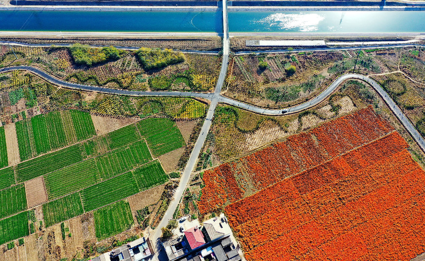 ↑位于河北石家庄境内的南水北调中线干渠及沿岸景色(2019年11月26日摄,无人机照片)。