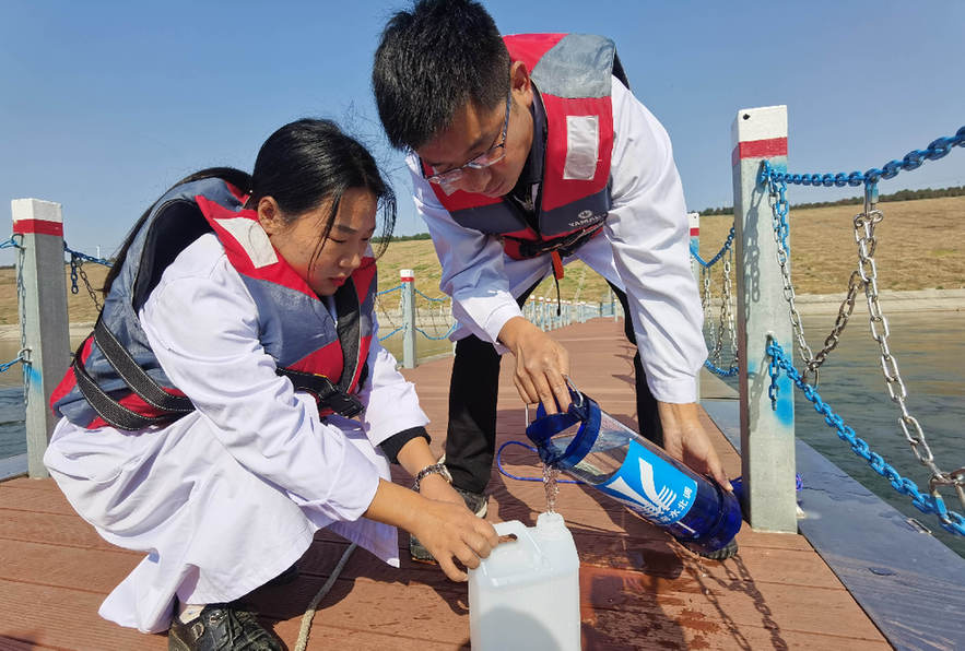 ↑工作人员在南水北调中线陶岔渠首监测水质(2020年11月12日摄)。