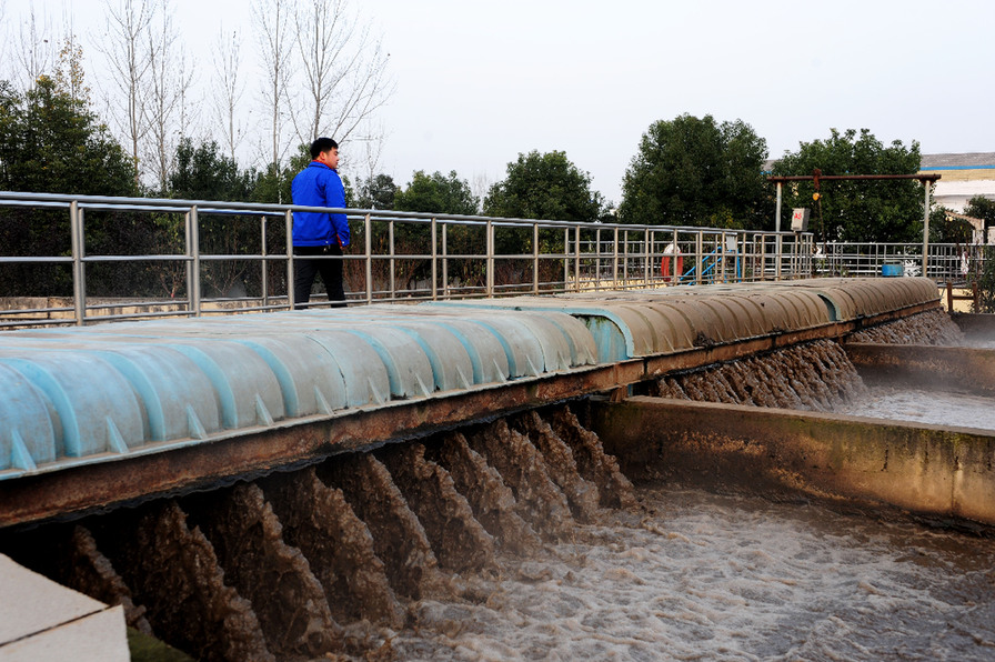 ↑在河南南阳淅川县污水处理厂,工作人员巡察设备运转状况(2015年11月27日摄)。作为南水北调中线工程的核心水源区和渠首所在地,淅川县是南水北调水质的重要护卫者。