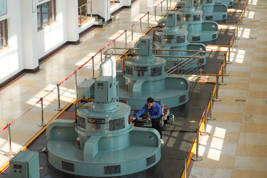 ↑工作人员在南水北调东线工程源头江苏扬州江都水利枢纽第三抽水机站巡检(2019年12月5日摄)。