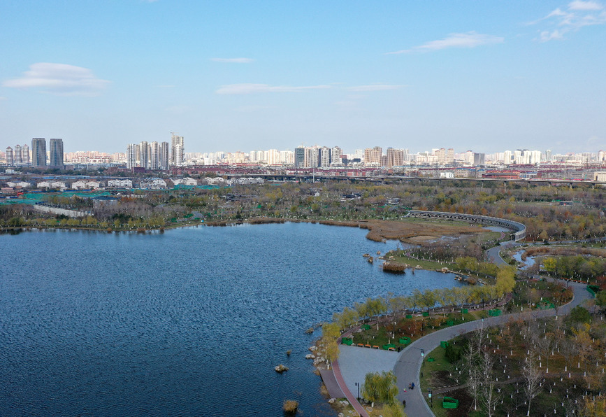 ↑位于天津市城区的水西公园风光(2020年11月19日摄,无人机照片)。南水北调中线工程有效补给了城市生产生活用水,为天津市生态补水和减少深层地下水开采创造了条件,替换出一部分引滦外调水,有效补充农业和生态环境用水,水系循环范围不断扩大。