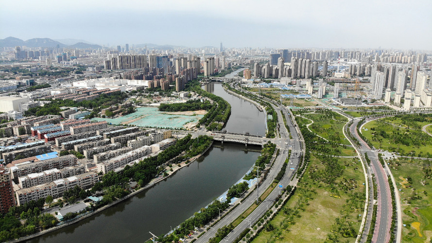 ↑山东济南小清河及沿岸风光(2020年6月1日摄,无人机照片)。南水北调东线为泉城济南保泉补源、小清河补水提供了有力支撑。