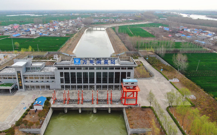 ↑位于山东枣庄的南水北调东线万年闸泵站(2021年3月18日摄,无人机照片)。