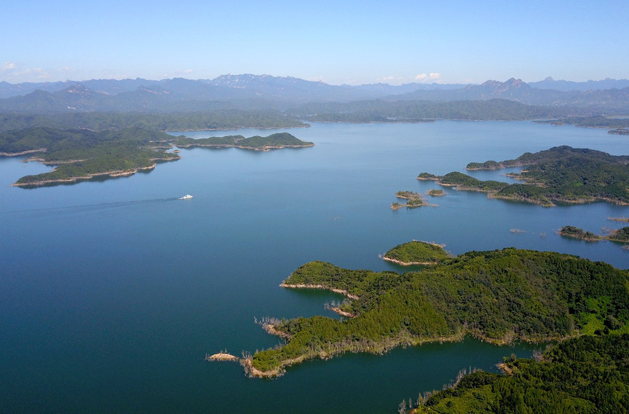 ↑北京密云水库风光(2020年9月1日摄,无人机照片)。北调的“南水”输入北京的“大水缸”——密云水库,使其蓄水量大增。
