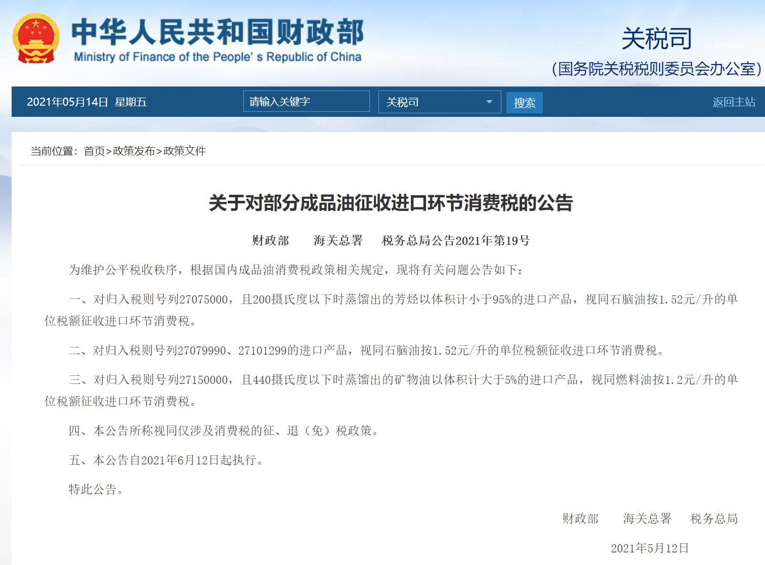 据财政部官网5月14日消息,近日,财政部、海关总署、税务总局发布公告,自2021年6月12日起,对部分成品油视同石脑油或燃料油征收进口环节消费税。
