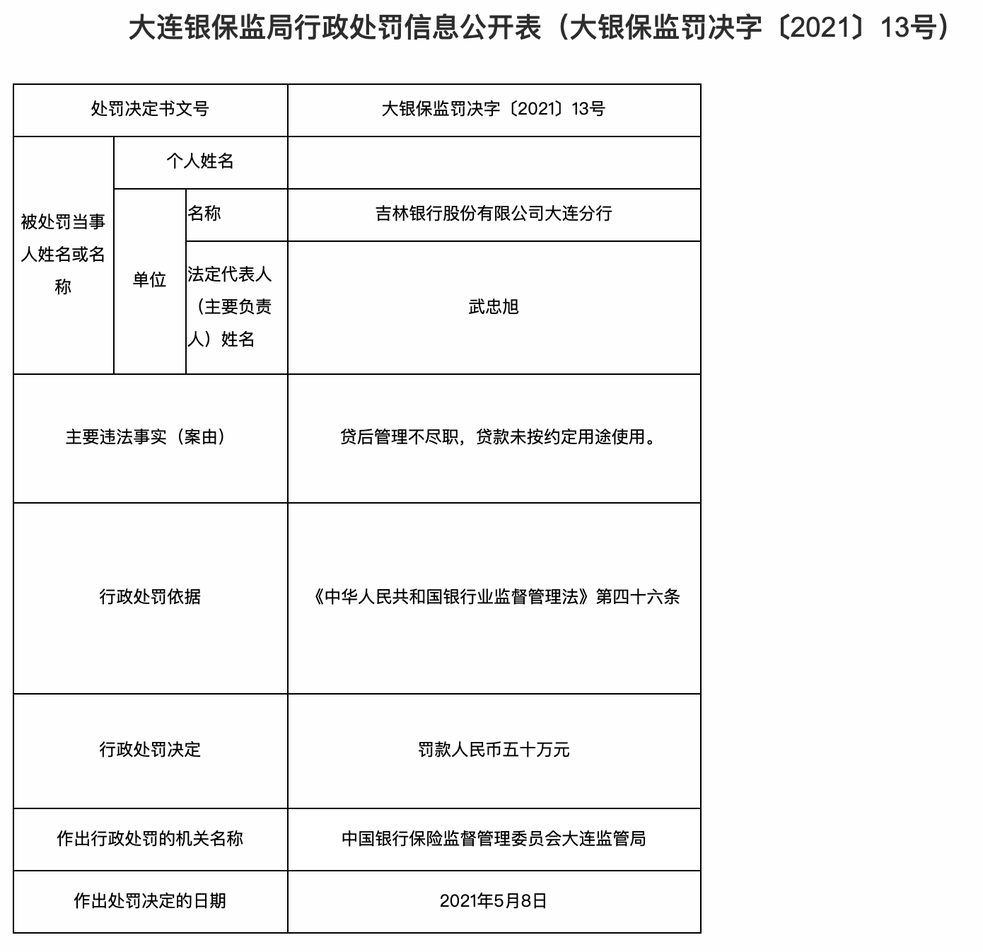 5月14日,大连银保监局发布的行政处罚信息公开表显示,吉林银行股份有限公司大连分行因贷后管理不尽职、贷款未按约定用途使用,被处罚款人民币五十万元。