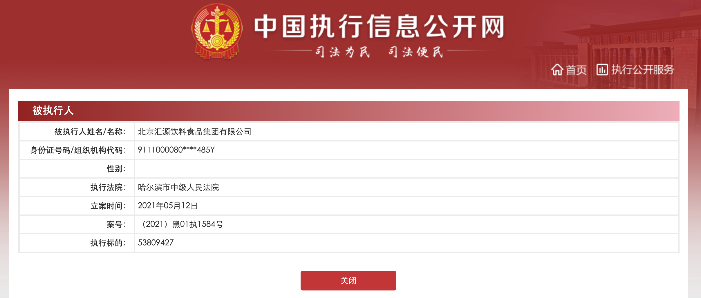 据天眼查APP显示,5月12日,北京汇源饮料食品集团有限公司再次成为被执行人,执行标的约5381万元,执行法院为哈尔滨市中级人民法院,案号(2021)黑01执1584号。目前该公司被执行总金额已超10.45亿元,并且涉及数十条失信被执行人(老赖)信息、限制消费令及终本案件。