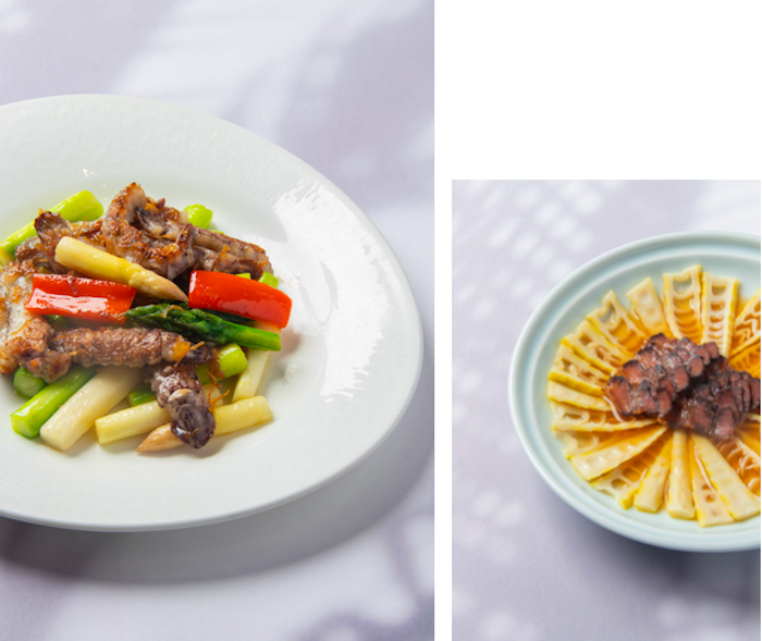 第二款和第三款推荐是主菜X.O酱芦笋爆炒富贵虾搭配霄峰酒庄霞多丽干白葡萄酒;另一道主菜清酱肉蒸春笋可搭配瓏岱干红葡萄酒。无论是芦笋还是春笋,季节性的笋吃过才知春味。笋肉饱满水嫩搭配着细腻入口的清蒸肉,口感丰富,鲜香与爽脆全部在一口之中,搭配干白葡萄酒或干红葡萄酒能提升不少美味的丰富度。