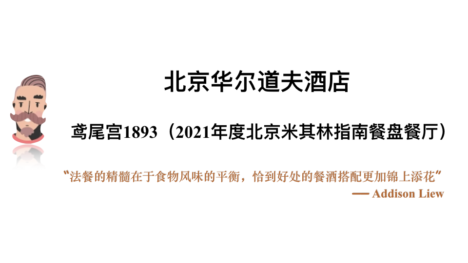 北京华尔道夫的鸢尾宫1893餐厅被评为2021北京米其林指南餐盘奖。餐厅以新式法餐菜肴为主,精选新鲜食材并以季节更替为灵感来创作。主厨Addison Liew来自马来西亚,据介绍目前已拥有超过15年的烹饪经验,曾在多家米其林法餐厅任职,包括Pourcel兄弟名下的米其林星级餐厅,香港文华东方的米其林二星餐厅Pierre Gagnaire并在米其林三星餐厅Joel Robuchon担任副厨,还在澳门米其林二星餐厅Guillaume Gailliot担任过5年的高级副厨师长。