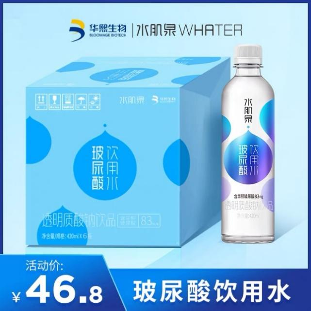 这款水肌泉玻尿酸饮用水的单价大约为8元/瓶,是普通矿泉水售价的4倍左右,每瓶420毫升含食品级华熙玻尿酸83mg,主打效果为补水以及0糖0脂0能量。