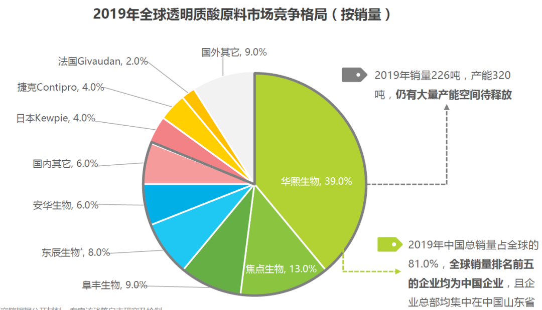 从全球来看,中国早已是全球最大的玻尿酸原料供给国。艾瑞咨询发布的《2020年透明质酸应用场景白皮书》显示,全球销量排名前五的玻尿酸生产企业均为中国企业,仅华熙生物1家企业就贡献了39%的销量。