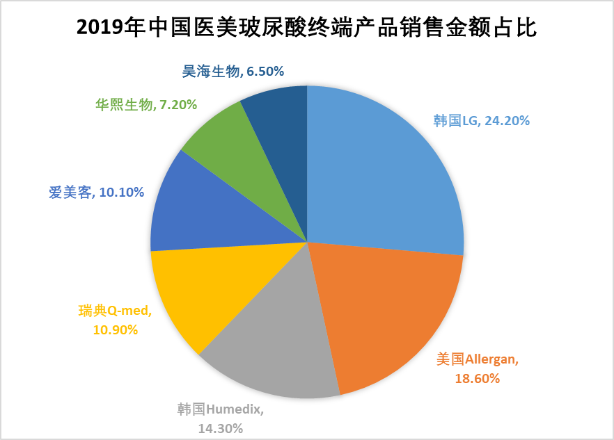 从产业链的角度来看,尽管在玻尿酸原料供给端占据绝对优势,我国的医美玻尿酸市场却一直被进口玻尿酸品牌占据着主导地位。2019年中国医美玻尿酸终端产品销售额排名前四均为外国企业,分别是韩国LG、美国Allergan、韩国Humedix和瑞典Q-med,市场集中度高达68%。