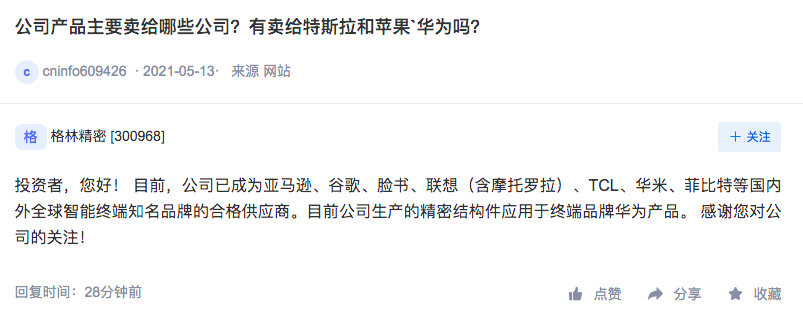 格林精密13日在互动易上表示,目前,公司已成为亚马逊、谷歌、脸书、联想(含摩托罗拉)、TCL、华米、菲比特等国内外全球智能终端知名品牌的合格供应商。目前公司生产的精密结构件应用于终端品牌华为产品。