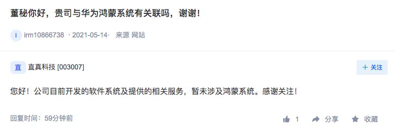 直真科技:公司目前开发的软件暂未涉及鸿蒙系统
