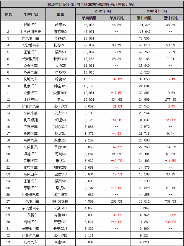 其中,长城哈弗H6已经连续数月稳坐SUV销量冠军,2016年3月仍然不例外,其在3月份的销量为4.6万辆,比上年同期增长达46.5%。1-3月的累计同比增长为38.3%。