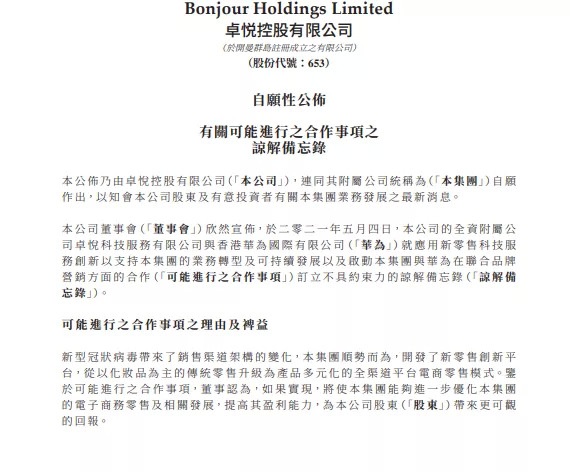 5月4日晚,卓悦控股(香港化妆品零售品牌)在港交所发布公告,其全资子公司卓悦科技与华为子公司香港华为国际有限公司订立不具约束力的备忘录。