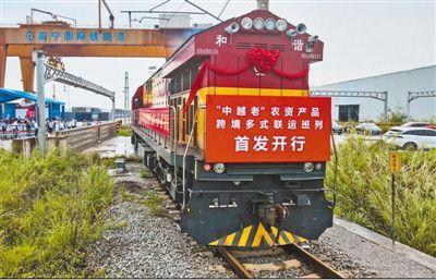 5月13日,广西开行首趟“中越老”农资产品跨境多式联运班列。班列搭载装满复合肥料的集装箱从南宁国际铁路港出发,经凭祥口岸出境,驶往越南,转公路运往老挝。新华社记者 张爱林摄