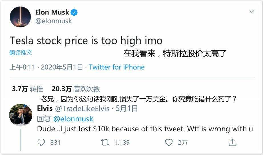 2020年5月1日,历史重演,马斯克发推表示“在我看来,特斯拉股价太高了”,话音刚落,特斯拉股价大跌超过11%,市值蒸发了140亿美元。
