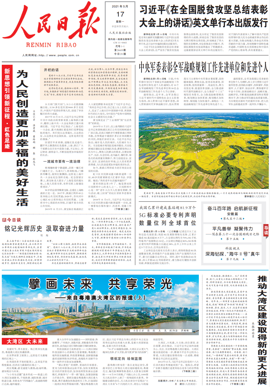 今天《人民日报》的主要内容有: 1、我国已累计建成基站超81.9万个,5G标准必要专利声明数量位列全球首位。 2、教育部基础教育司:切实增强人民群众教育获得感。 3、首诊责任不落实、监管履职不力,多人因辽宁鲅鱼圈新冠肺炎疫情被问责。 4、安徽六安有关单位和个人违反首诊负责制被处理。 5、上海多部门协作,坚持“人”和“物”同防。 6、欧洲三家铁路公司因组成垄断联盟受罚。 7、古巴启动本土候选新冠疫苗接种。 8、人民日报评论员:推动大湾区建设取得新的更大进展。 9、民营企业“前途不可限量”(人民时评)。