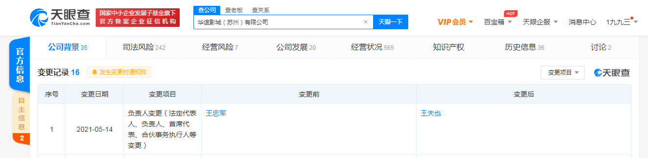 据天眼查APP显示,近日,华谊影城(苏州)有限公司发生工商变更,王忠军退出法定代表人,由王夫也接任。
