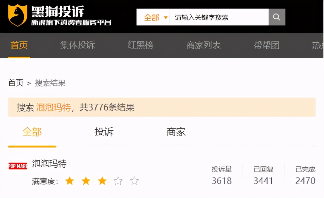 根据黑猫投诉,泡泡玛特投诉量达到3618条,其中内容多为“物品瑕疵”、“货不对版、卡片与实物不符”,其中单搜索“Skullpanda”也能找到“存在瑕疵”、“拦截不发货”等问题。