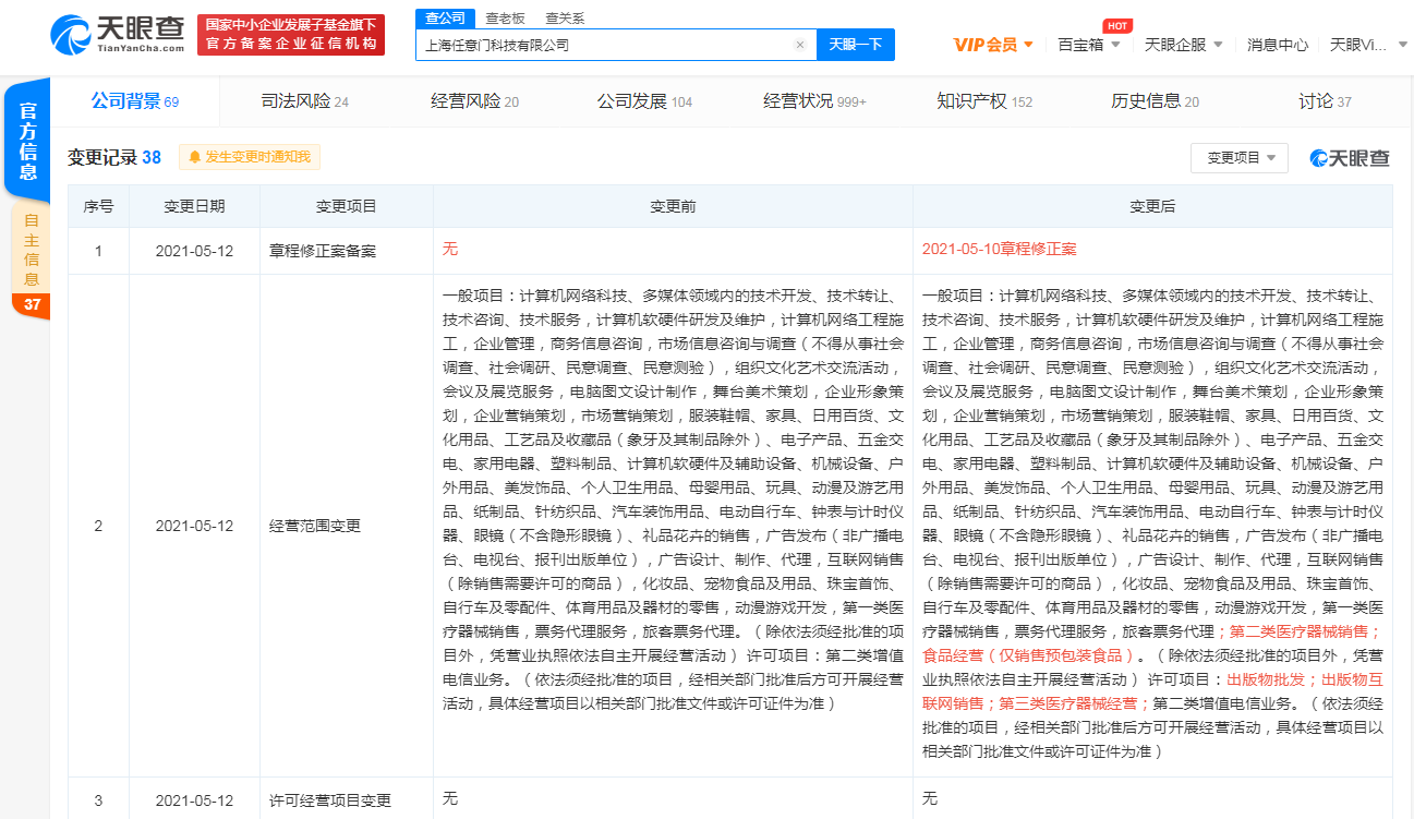 据天眼查APP显示,近日,Soul关联公司上海任意门科技有限公司发生多项工商变更,经营范围新增第二类医疗器械销售;食品经营(仅销售预包装食品);出版物互联网销售等。