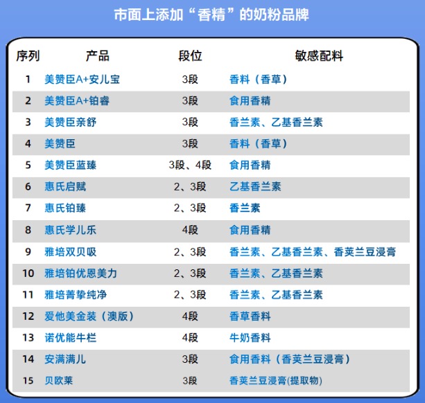 据据乳制品测评平台乳品之家统计,美赞臣、惠氏、雅培、爱他美、诺优能等多个外资品牌的15款奶粉配料中添加了香料。