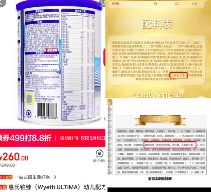 界面新闻自电商平台查询发现,惠氏铂臻3段、雅培双倍吸2、3段、美赞臣铂睿全跃3段等配方的配料表中,均含有乙基香兰素、香兰素等,但内资品牌如飞鹤、君乐宝、贝因美等品牌奶粉配料表中不含上述香料。