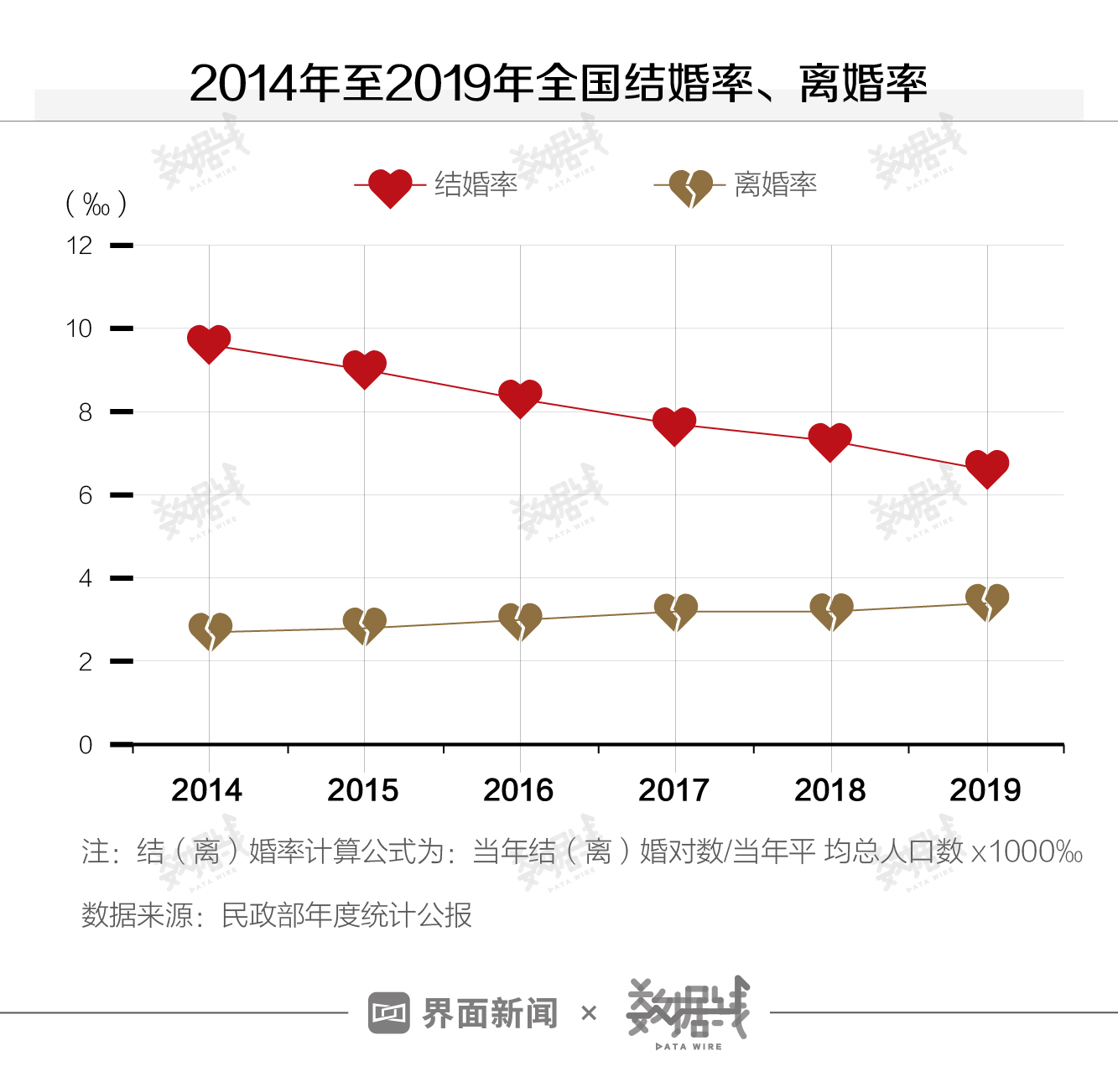 从2014年至2019年,我国离婚率不断上升,从每年2.7‰升至3.4‰;且结婚率不断下降,从每年9.6‰降至6.6‰。