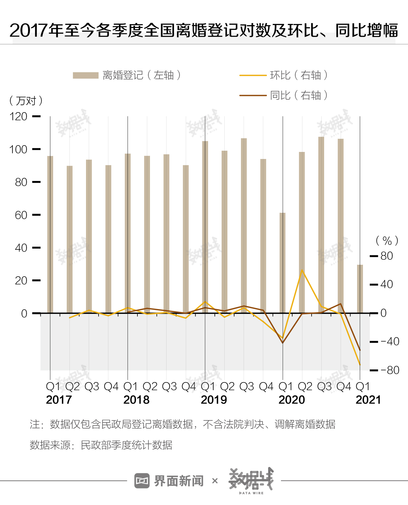 受此影响,2021年第一季度全国离婚登记数仅29.6万对,远低于2017年以来各季度数据,环比2020年第四季度下降了超七成,同比2020年第一季度疫情期间的离婚率也下降了一半以上。