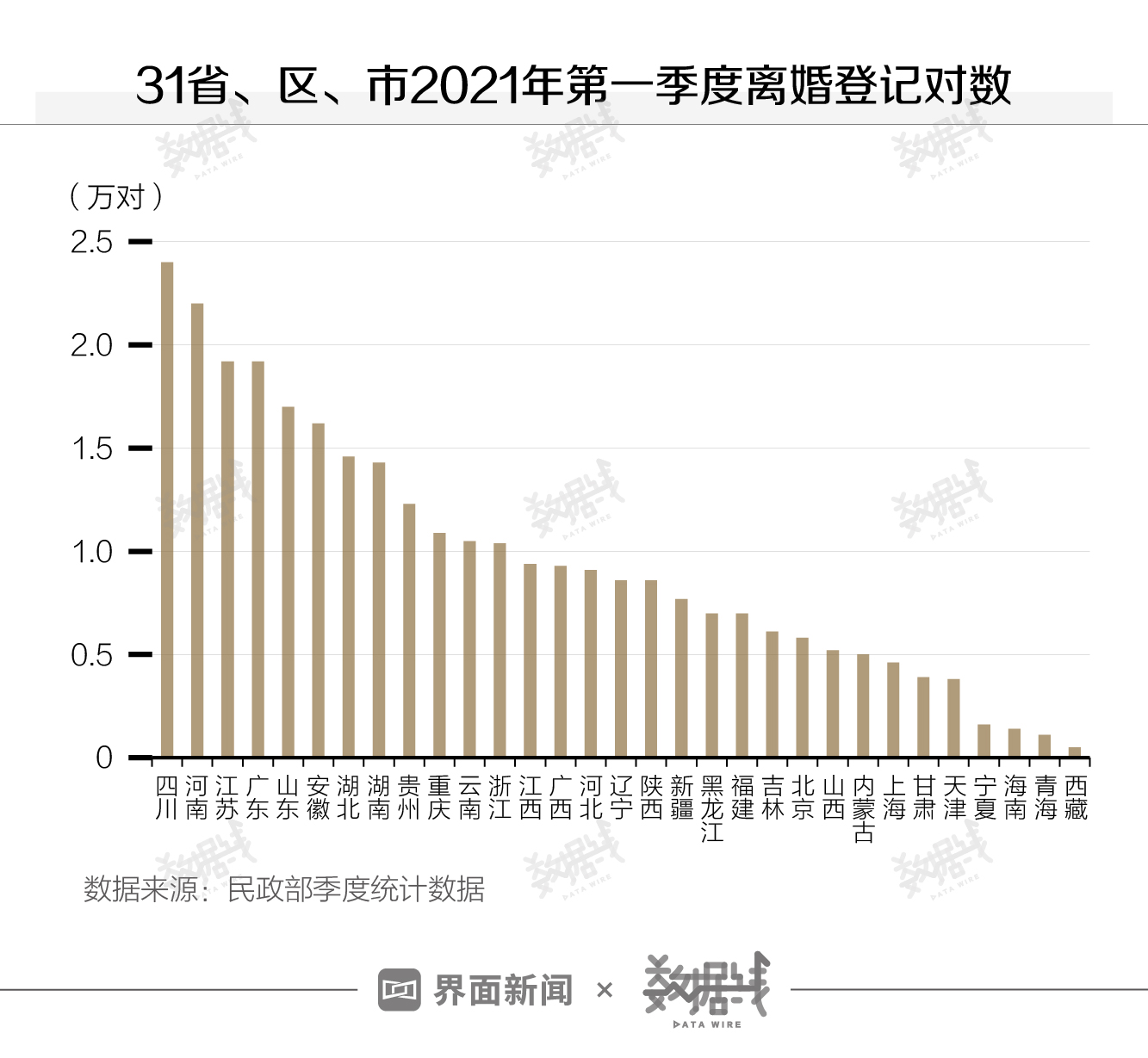从各省离婚登记数量来看,四川为全国第一,河南为全国第二,两省第一季度离婚数均在2万对以上。江苏和广东离婚数字相差不大,都为近2万对。山东离婚数排第五,为1.7万对。