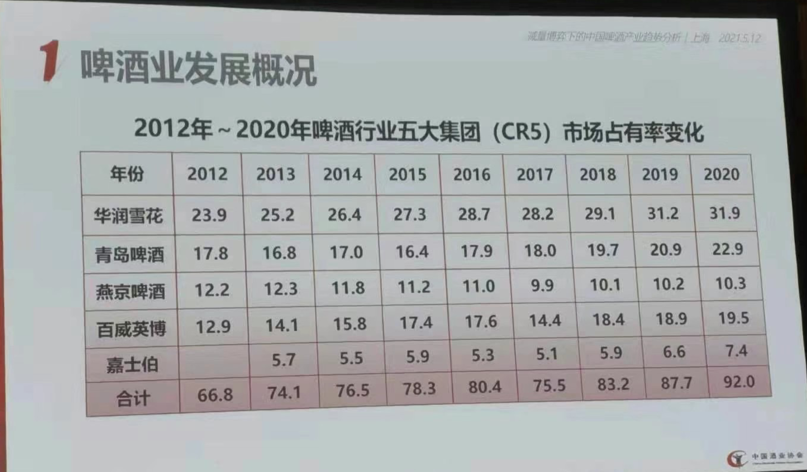 对比行业来看,华润雪花市场占有率从2012年的23.9%上涨至2020年31.9%;青岛啤酒从2012年的17.8%上涨至2020年的22.90%;百威英博从2012年的12.9%上升至2020年的19.5%。