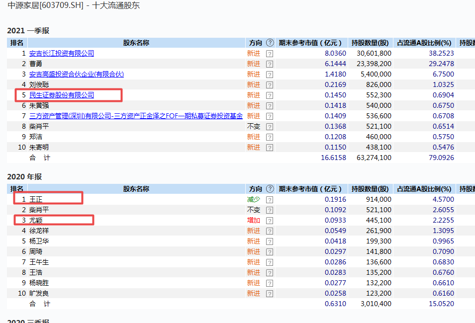 譬如,《红周刊》记者注意到,2018年以来,中源家居的流通股东均长期以牛散为主,且变动频繁,风格上基本以快进快出为主。譬如,2020年,一位名为“尤颖”的牛散持续增持,一度成为第三大流通股东,但到2021年1季报时,其从十大流通股东中彻底消失。和“尤颖”同进退的还有另一位牛散“王正”,其也曾是中源家居2020年底时的最大流通股东。