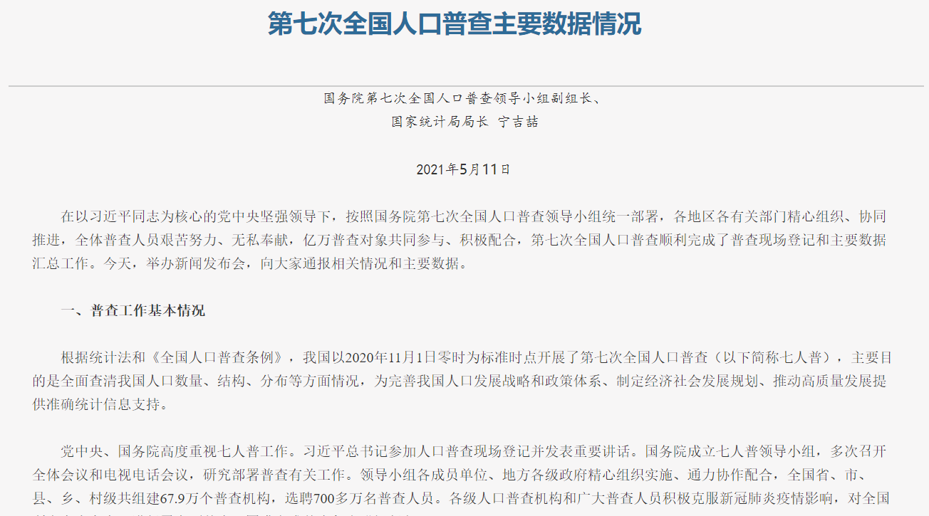 5月11日,被大众期待已久的全国第七次人口普查数据终于出炉。