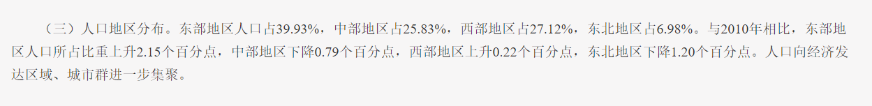 与2010年相比,东部地区人口所占比重上升2.15%,中部地区下降0.79%,西部地区上升0.22%,东北地区下降1.20%。
